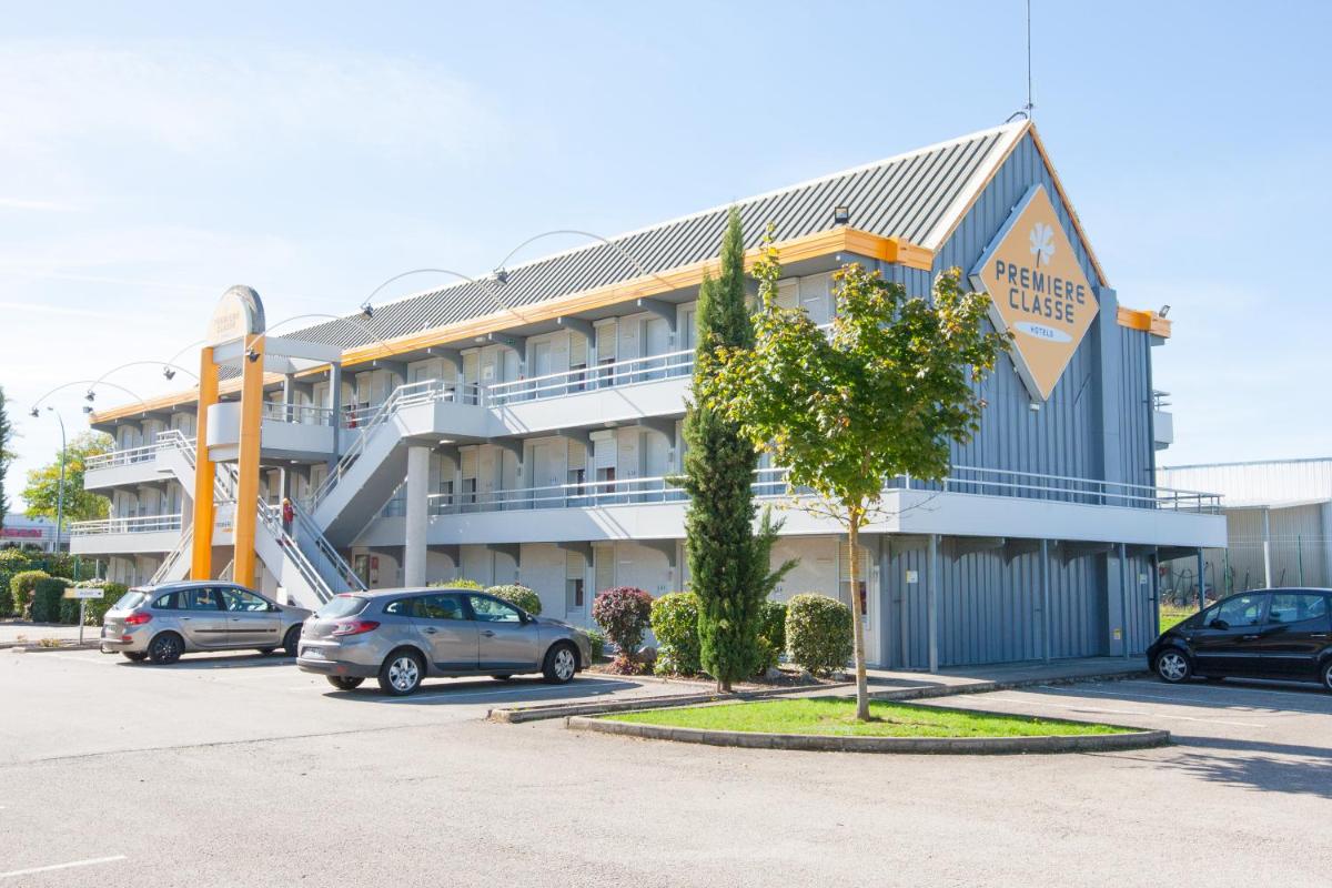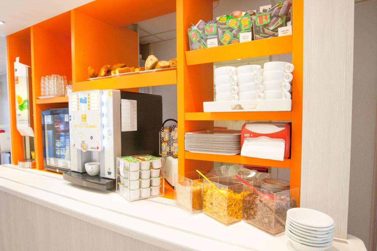Photos show compact yet functional rooms with neutral décor, bright bathrooms, and flat-screen TVs. The breakfast space is simple, with a buffet counter and seating. Exterior shots highlight the hotel’s recognizable façade and its location in Dijon’s northern business district, with free parking at the doorstep.
